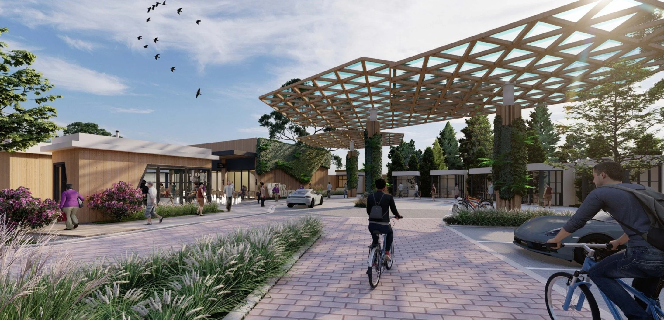 Together, these strategies unify the residential and commercial areas into a legible, inviting, and durable community destination.